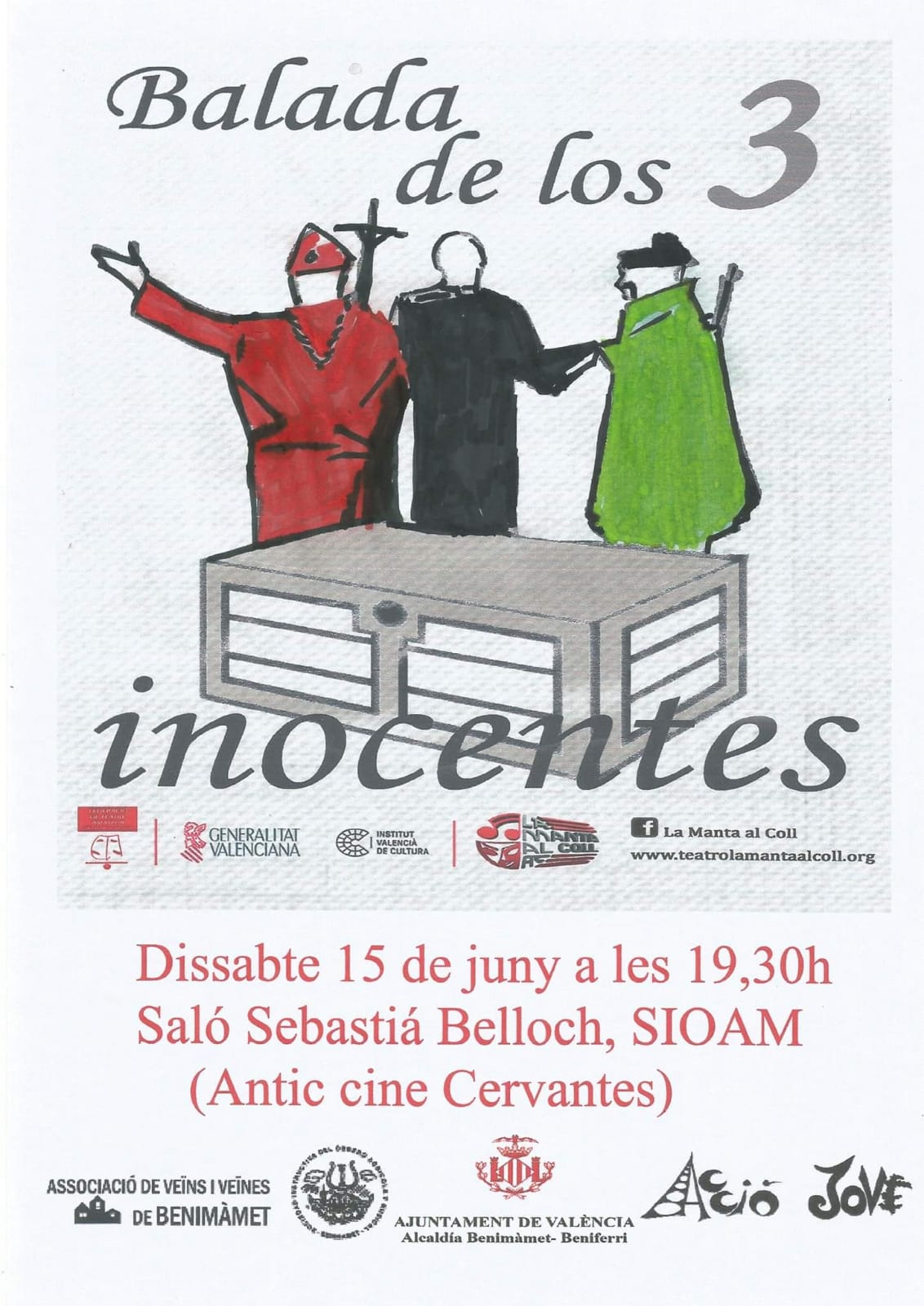 La Manta al Coll viaja este Domingo 22 de Septiembre hasta Cárcer para representar la obra «La Balada de los 3 Inocentes». Ven a pasar un rato divertido con esta comedia de Pedro Mario Herrero.