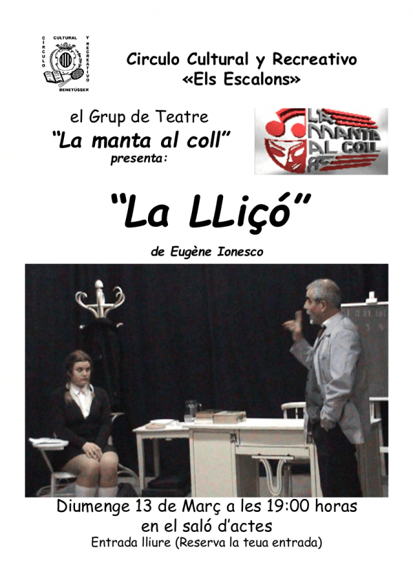 El proper diumenge 13 de març a les 19:00 hores estrenarem la nostra adaptació de La Lliçó d’ Eugène Ionesco, una de les obres mes representatives de l’anomenat teatre de l’absurd.